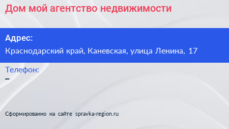 Дом мой, агентство недвижимости по адресу Краснодарский край, Каневская, улица Ленина, 17 в дальнейшем Организация, размещена в следующих категориях: