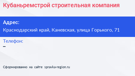 Кубаньремстрой, строительная компания по адресу Краснодарский край, Каневская, улица Горького, 71 в дальнейшем Организация, размещена в следующих категориях:
