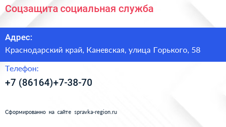 Соцзащита, социальная служба по адресу Краснодарский край, Каневская, улица Горького, 58 в дальнейшем Организация, размещена в следующих категориях: