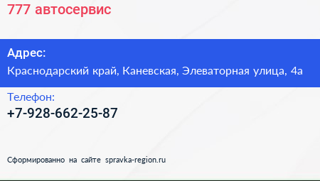 777, автосервис по адресу Краснодарский край, Каневская, Элеваторная улица, 4а в дальнейшем Организация, размещена в следующих категориях: