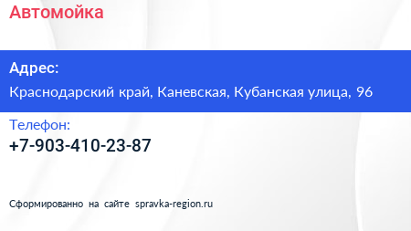 Автомойка по адресу Краснодарский край, Каневская, Кубанская улица, 96 в дальнейшем Организация, размещена в следующих категориях: