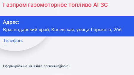 Газпром газомоторное топливо, АГЗС по адресу Краснодарский край, Каневская, улица Горького, 266 в дальнейшем Организация, размещена в следующих категориях: