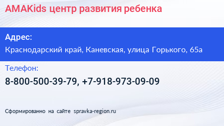 AMAKids, центр развития ребенка по адресу Краснодарский край, Каневская, улица Горького, 65а в дальнейшем Организация, размещена в следующих категориях: