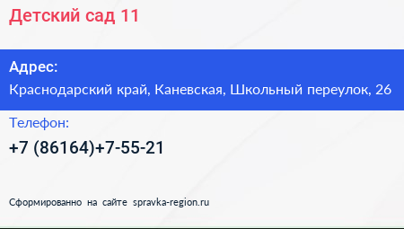 Детский сад №11 по адресу Краснодарский край, Каневская, Школьный переулок, 26 в дальнейшем Организация, размещена в следующих категориях: