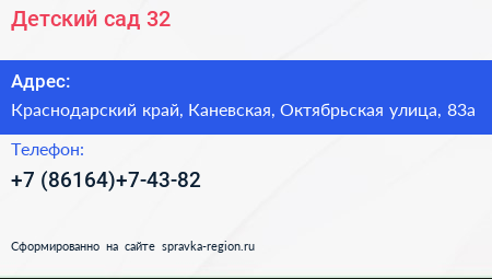 Детский сад №32 по адресу Краснодарский край, Каневская, Октябрьская улица, 83а в дальнейшем Организация, размещена в следующих категориях: