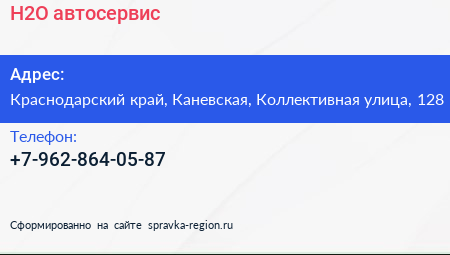 H2O, автосервис по адресу Краснодарский край, Каневская, Коллективная улица, 128 в дальнейшем Организация, размещена в следующих категориях: