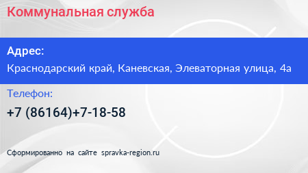 Коммунальная служба по адресу Краснодарский край, Каневская, Элеваторная улица, 4а в дальнейшем Организация, размещена в следующих категориях: