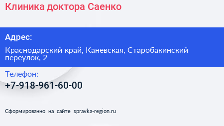 Клиника доктора Саенко по адресу Краснодарский край, Каневская, Старобакинский переулок, 2 в дальнейшем Организация, размещена в следующих категориях: