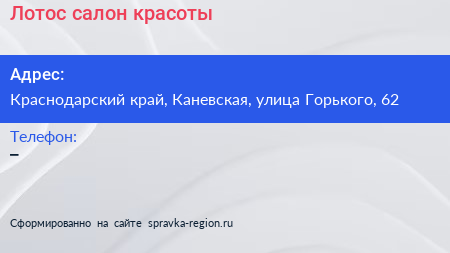 Лотос, салон красоты по адресу Краснодарский край, Каневская, улица Горького, 62 в дальнейшем Организация, размещена в следующих категориях: