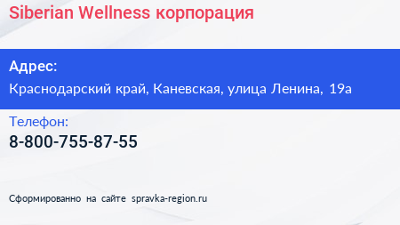 Siberian Wellness, корпорация по адресу Краснодарский край, Каневская, улица Ленина, 19а в дальнейшем Организация, размещена в следующих категориях: