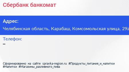 Сбербанк, банкомат по адресу Челябинская область, Карабаш, Комсомольская улица, 29а в дальнейшем Организация, размещена в следующих категориях: