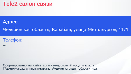 Tele2, салон связи по адресу Челябинская область, Карабаш, улица Металлургов, 11/1 в дальнейшем Организация, размещена в следующих категориях: