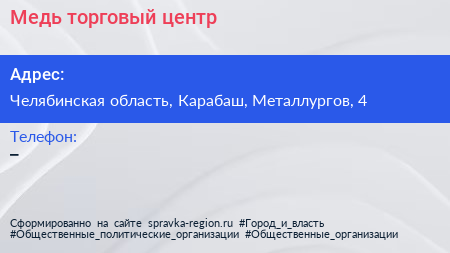 Медь, торговый центр по адресу Челябинская область, Карабаш, Металлургов, 4 в дальнейшем Организация, размещена в следующих категориях: