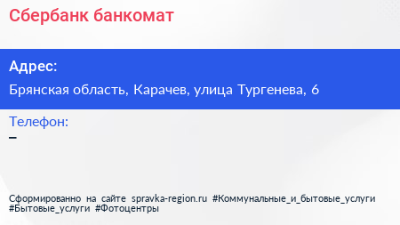 Сбербанк, банкомат по адресу Брянская область, Карачев, улица Тургенева, 6 в дальнейшем Организация, размещена в следующих категориях: