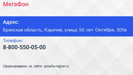 МегаФон по адресу Брянская область, Карачев, улица 50 лет Октября, 105в в дальнейшем Организация, размещена в следующих категориях: