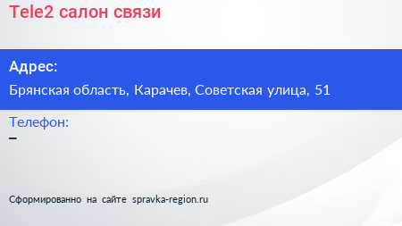 Tele2, салон связи по адресу Брянская область, Карачев, Советская улица, 51 в дальнейшем Организация, размещена в следующих категориях:
