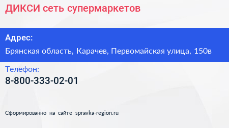 ДИКСИ, сеть супермаркетов по адресу Брянская область, Карачев, Первомайская улица, 150в в дальнейшем Организация, размещена в следующих категориях: