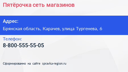 Пятёрочка, сеть магазинов по адресу Брянская область, Карачев, улица Тургенева, 6 в дальнейшем Организация, размещена в следующих категориях: