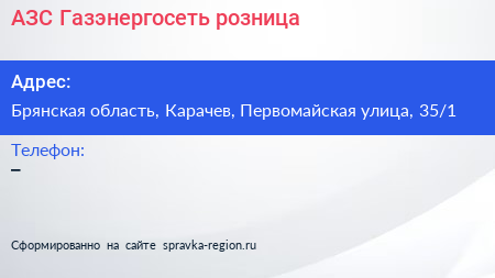АЗС, Газэнергосеть розница по адресу Брянская область, Карачев, Первомайская улица, 35/1 в дальнейшем Организация, размещена в следующих категориях: