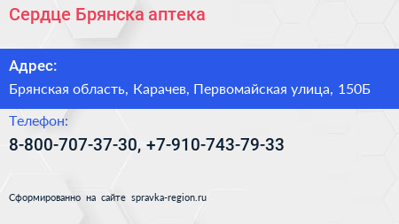 Сердце Брянска, аптека по адресу Брянская область, Карачев, Первомайская улица, 150Б в дальнейшем Организация, размещена в следующих категориях: