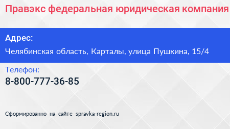 Правэкс, федеральная юридическая компания по адресу Челябинская область, Карталы, улица Пушкина, 15/4 в дальнейшем Организация, размещена в следующих категориях: