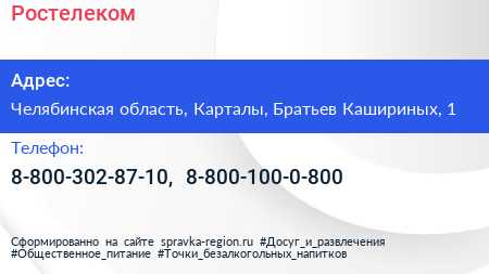 Ростелеком по адресу Челябинская область, Карталы, Братьев Кашириных, 1 в дальнейшем Организация, размещена в следующих категориях: