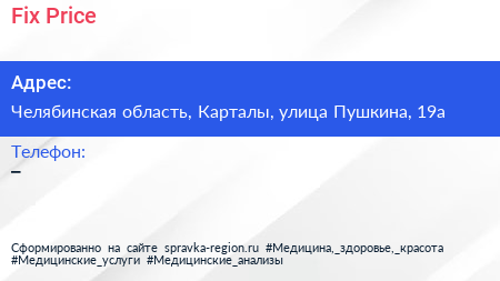 Fix Price по адресу Челябинская область, Карталы, улица Пушкина, 19а в дальнейшем Организация, размещена в следующих категориях: