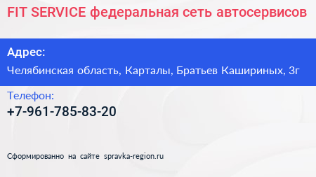 FIT SERVICE, федеральная сеть автосервисов по адресу Челябинская область, Карталы, Братьев Кашириных, 3г в дальнейшем Организация, размещена в следующих категориях:
