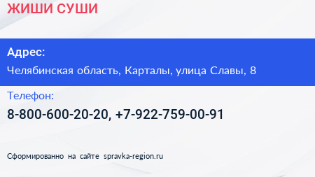 ЖИШИ СУШИ по адресу Челябинская область, Карталы, улица Славы, 8 в дальнейшем Организация, размещена в следующих категориях: