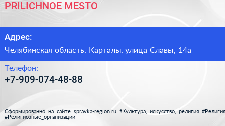 PRILICHNOE MESTO по адресу Челябинская область, Карталы, улица Славы, 14а в дальнейшем Организация, размещена в следующих категориях: