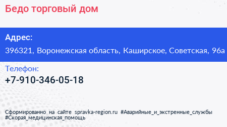 Бедо, торговый дом по адресу 396321, Воронежская область, Каширское, Советская, 96а в дальнейшем Организация, размещена в следующих категориях: