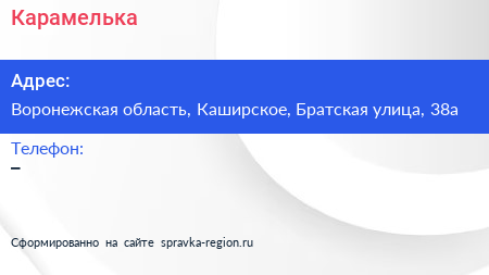 Карамелька по адресу Воронежская область, Каширское, Братская улица, 38а в дальнейшем Организация, размещена в следующих категориях: