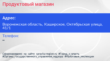 Продуктовый магазин по адресу Воронежская область, Каширское, Октябрьская улица, 41/1 в дальнейшем Организация, размещена в следующих категориях: