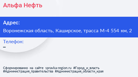 Альфа-Нефть по адресу Воронежская область, Каширское, трасса М-4 554 км, 2 в дальнейшем Организация, размещена в следующих категориях: