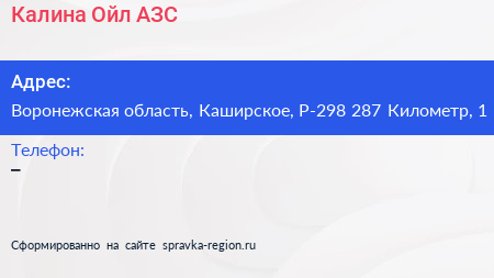 Калина Ойл, АЗС по адресу Воронежская область, Каширское, Р-298 287 Километр, 1 в дальнейшем Организация, размещена в следующих категориях: