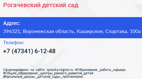 Рогачевский детский сад по адресу 396321, Воронежская область, Каширское, Спартака, 100а в дальнейшем Организация, размещена в следующих категориях:
