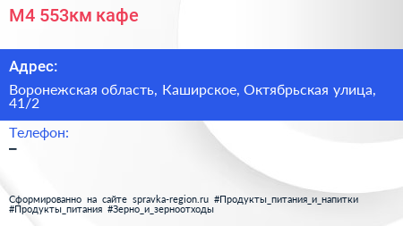 М4-553км, кафе по адресу Воронежская область, Каширское, Октябрьская улица, 41/2 в дальнейшем Организация, размещена в следующих категориях: