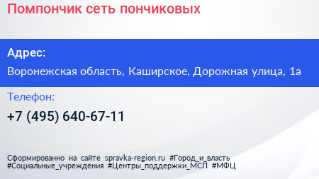 Помпончик, сеть пончиковых по адресу Воронежская область, Каширское, Дорожная улица, 1а в дальнейшем Организация, размещена в следующих категориях: