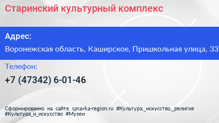Старинский культурный комплекс по адресу Воронежская область, Каширское, Пришкольная улица, 33 в дальнейшем Организация, размещена в следующих категориях: