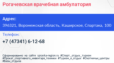 Рогачевская врачебная амбулатория по адресу 396321, Воронежская область, Каширское, Спартака, 100 в дальнейшем Организация, размещена в следующих категориях:
