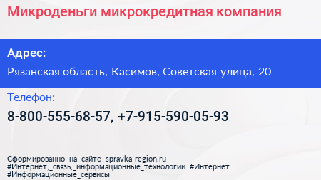 Микроденьги, микрокредитная компания по адресу Рязанская область, Касимов, Советская улица, 20 в дальнейшем Организация, размещена в следующих категориях: