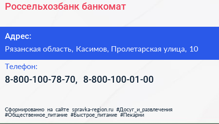 Россельхозбанк, банкомат по адресу Рязанская область, Касимов, Пролетарская улица, 10 в дальнейшем Организация, размещена в следующих категориях: