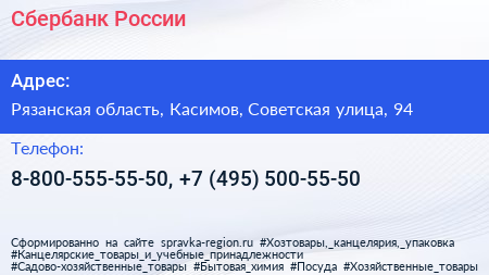 Сбербанк России по адресу Рязанская область, Касимов, Советская улица, 94 в дальнейшем Организация, размещена в следующих категориях: