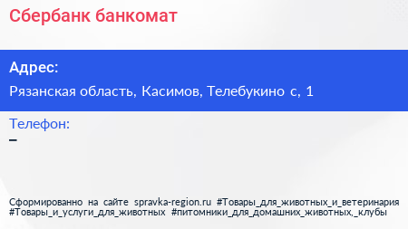 Сбербанк, банкомат по адресу Рязанская область, Касимов, Телебукино с, 1 в дальнейшем Организация, размещена в следующих категориях: