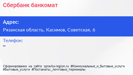 Сбербанк, банкомат по адресу Рязанская область, Касимов, Советская, 6 в дальнейшем Организация, размещена в следующих категориях: