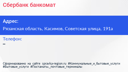 Сбербанк, банкомат по адресу Рязанская область, Касимов, Советская улица, 191а в дальнейшем Организация, размещена в следующих категориях: