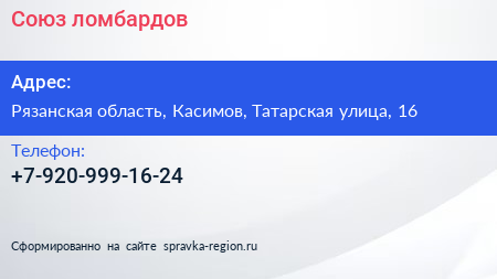 Союз ломбардов по адресу Рязанская область, Касимов, Татарская улица, 16 в дальнейшем Организация, размещена в следующих категориях: