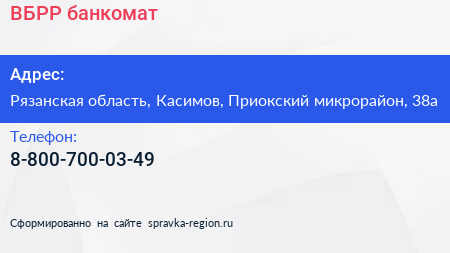 ВБРР, банкомат по адресу Рязанская область, Касимов, Приокский микрорайон, 38а в дальнейшем Организация, размещена в следующих категориях: