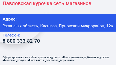 Павловская курочка, сеть магазинов по адресу Рязанская область, Касимов, Приокский микрорайон, 12а в дальнейшем Организация, размещена в следующих категориях: