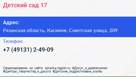 Детский сад №17 по адресу Рязанская область, Касимов, Советская улица, 209 в дальнейшем Организация, размещена в следующих категориях: